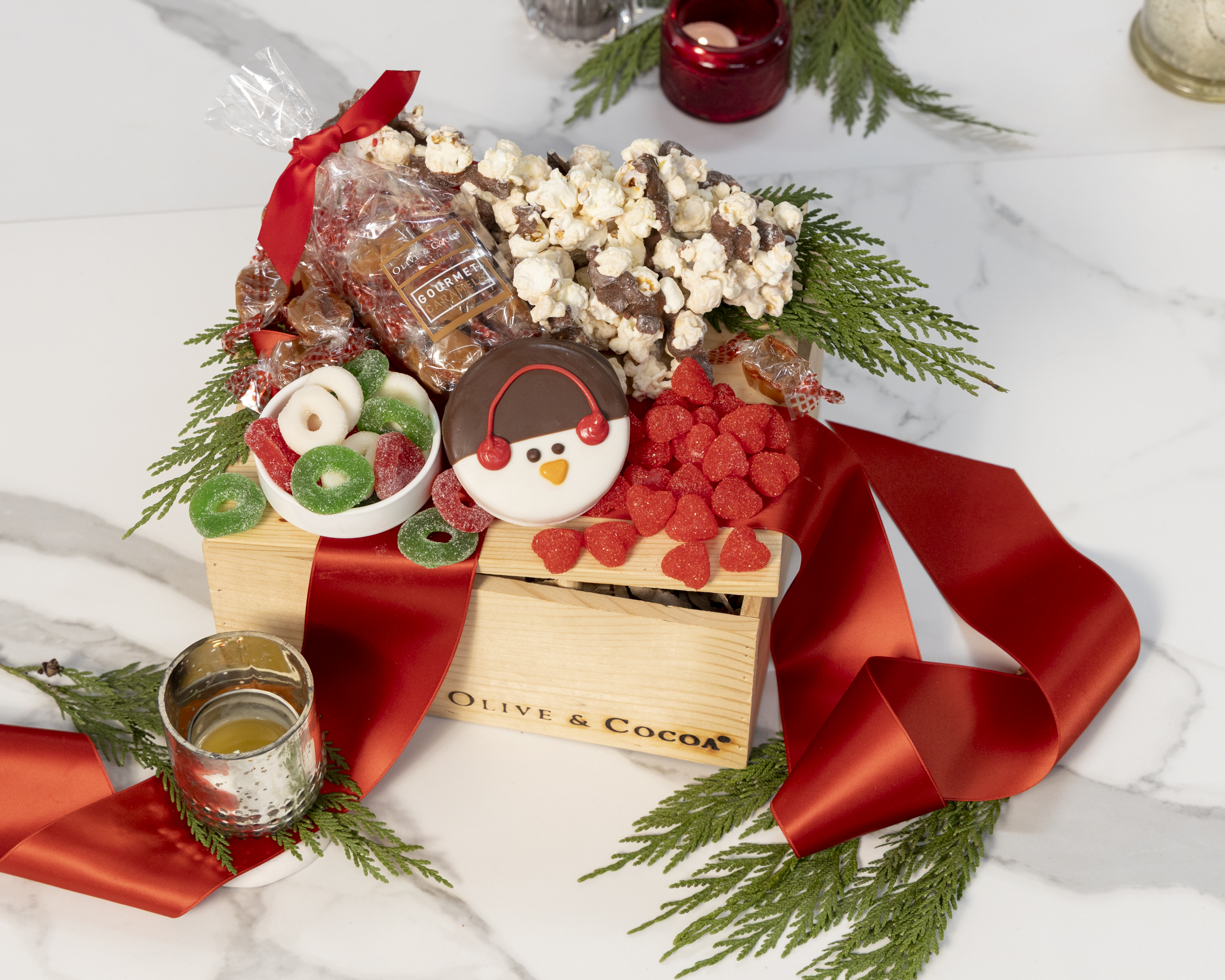 sku: UBS25H139Heartwarming and oh-so sweet, the Warm Wishes Crate brings holiday joy right to your door. Includes a penguin decorated sugar cookie, gummy wreaths, cinnamon hearts, pecan caramels, and rocky road popcorn. Comes gift wrapped in a handcrafted wood crate with ribbon. Features your logo hot-iron branded onto the wood crate.