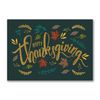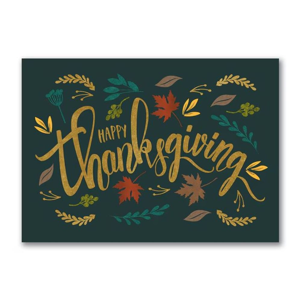 sku: UBS99679Autumn leaves depicted in deep shades of orange, green and brown surround a greeting printed in faux gold foil that contrasts beautifully with the hunter green background of a Thanksgiving card that sends holiday wishes to one and all. Dimensions: 7 7/8" x 5 5/8" Folded. Price includes printed card with blank envelope. Paper: White Smooth 100 lb. Features your logo inside the card.