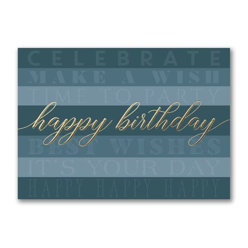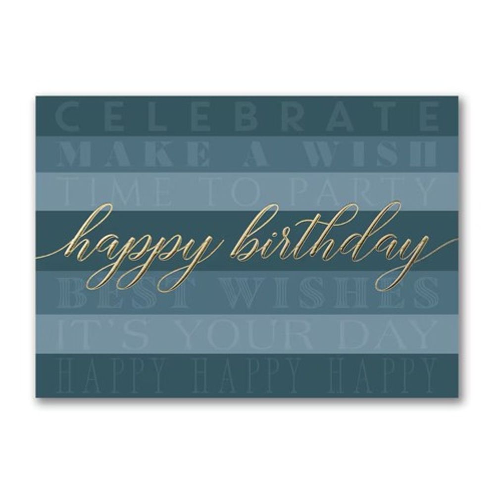 sku: UBS99691A classic choice with professional style, these birthday cards feature "happy birthday" in gold foil against stripes in various shades of blue and birthday wishes faded in the background. Dimensions: 7 7/8" x 5 5/8" Folded. Price includes printed card with blank envelope. Paper: White Smooth 100 lb. Features your logo inside the card.
