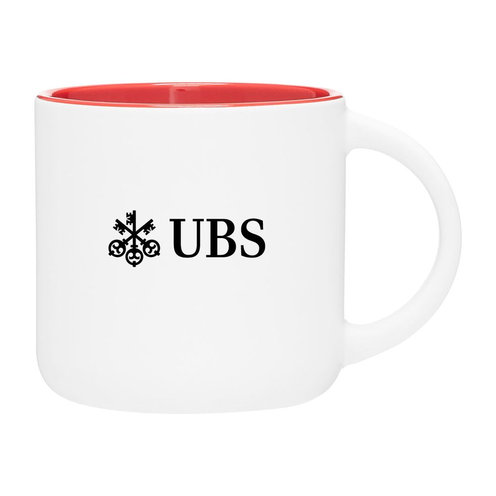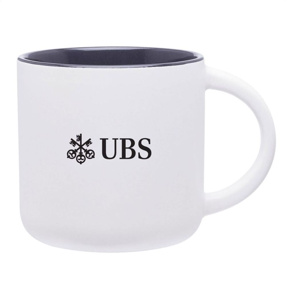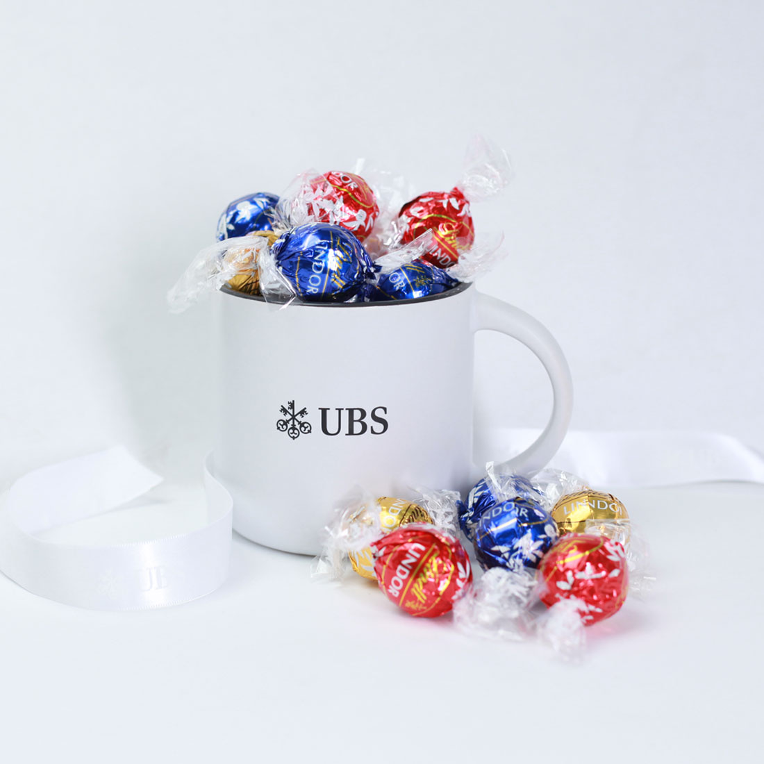 sku: UBS1006KSingle wall ceramic mug with matte exterior and glossy interior. Capacity: 14 oz. Features your logo. Hand wash recommended. Microwave safe. Packaged in a mug mailer. Filled with Lindt chocolates.