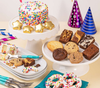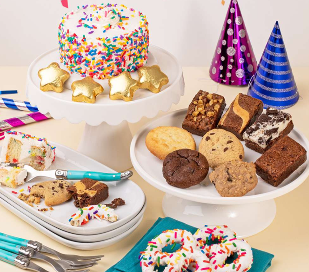 sku: ST25H142Wish them the happiest of birthdays with this delightful birthday bakery box! This festive gift includes four delicious cookies (Chocolate Chunk, Oatmeal Raisin, Vanilla Sugar and Triple Chocolate), four brownies, four gold foil-wrapped chocolate stars, two chocolate dipped pretzels, and a delightful mini vanilla birthday cake. Each birthday bakery box will arrive with a personalized greeting card. Serving Size: 6-8 People. Certified Kosher Dairy.