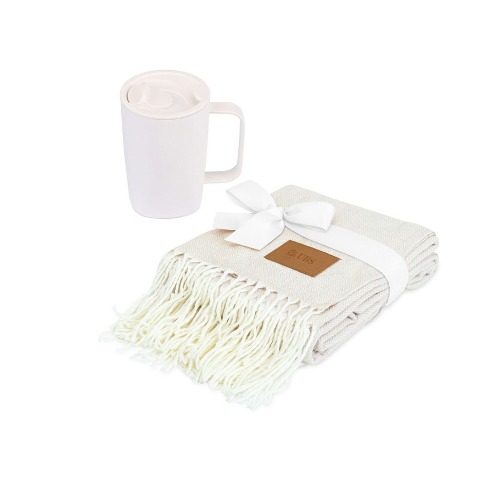 Treat someone special to the ultimate relaxation and indulgence with 'All Wrapped Up' – a gift set that wraps you in comfort and delight. Includes a throw blanket, ensuring enduring comfort and style and a recycled mug with lid.