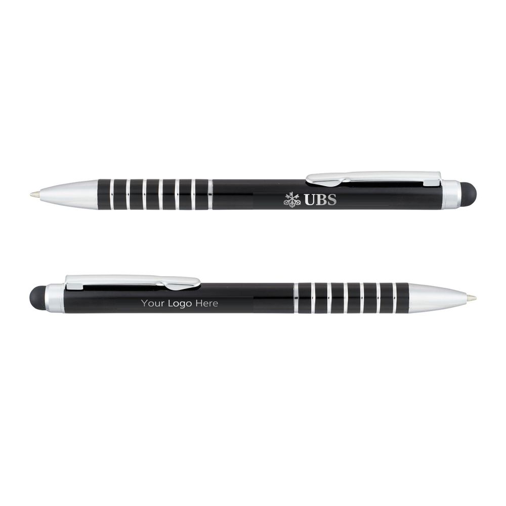 sku: UBS509VACombines a classic ballpoint silhouette with an added stylus function, providing a versatile and tech-friendly accessory. Features a comfortable grip artfully textured with chrome rings. Retractable twist-action mechanism. Contains a standard blue ballpoint ink cartridge. Made from aluminum.