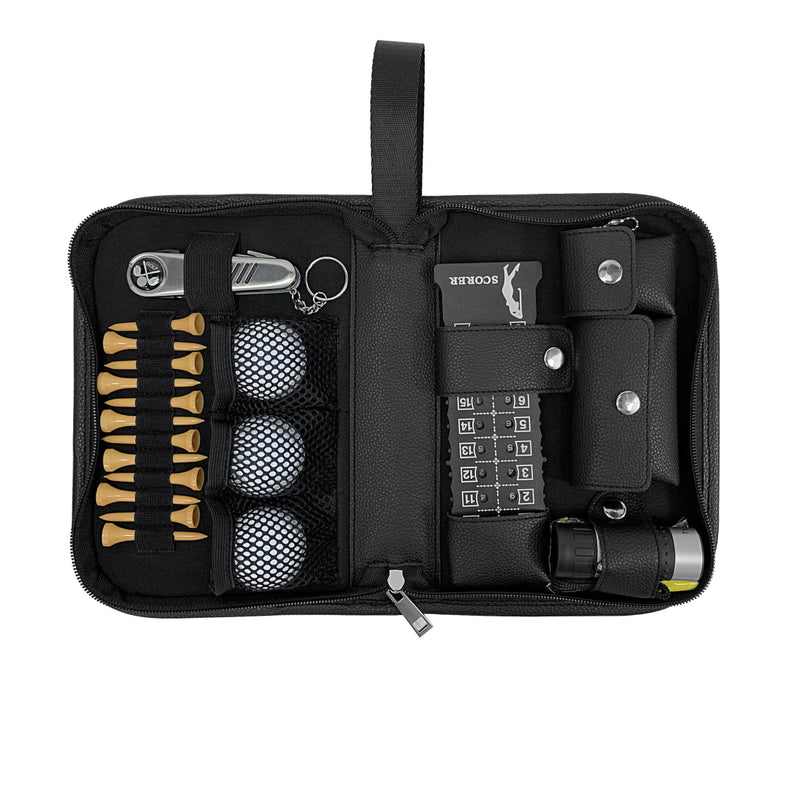 sku: UBS2692BKKCrafted from luxurious vegan leather, this eco-friendly case exudes timeless elegance, making a statement on and off the course. Organized for the modern golfer, it includes a sleek scoreboard, precision rangefinder, and a multifunctional divot knife for fixing divots or opening a drink. With a durable cleaning brush and a handy golf ball clamp with clip, every detail is designed for convenience. Complete with 12 tees and 3 premium golf balls, this case ensures you're always ready for excellence. Your logo is featured on the zip pull.