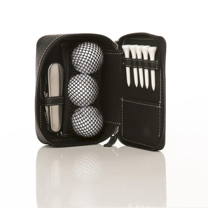 sku: UBS2693BKKThe Mini Golf Club set features everything you need for a day on the course. This set contains 3 golf balls, 5 tees, a divot repair tool, and comes in a sleek genuine leather case. Your logo is featured on the zip pull.