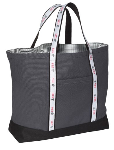 sku: UBS104GYThis spacious boat bag features black and white striped lining and your logo on the handles. Open top. Designed and manufactured in the USA exclusively by Scarborough & Tweed. Gray Canvas with Black Webbing and Bottom.